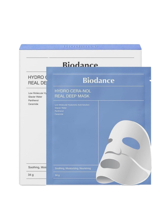 ماسک نقابی ورقه ای هیدرو سرانول بایودنس حاوی سرم هایی برای روشن شدن و شفاف شدن پوست است.