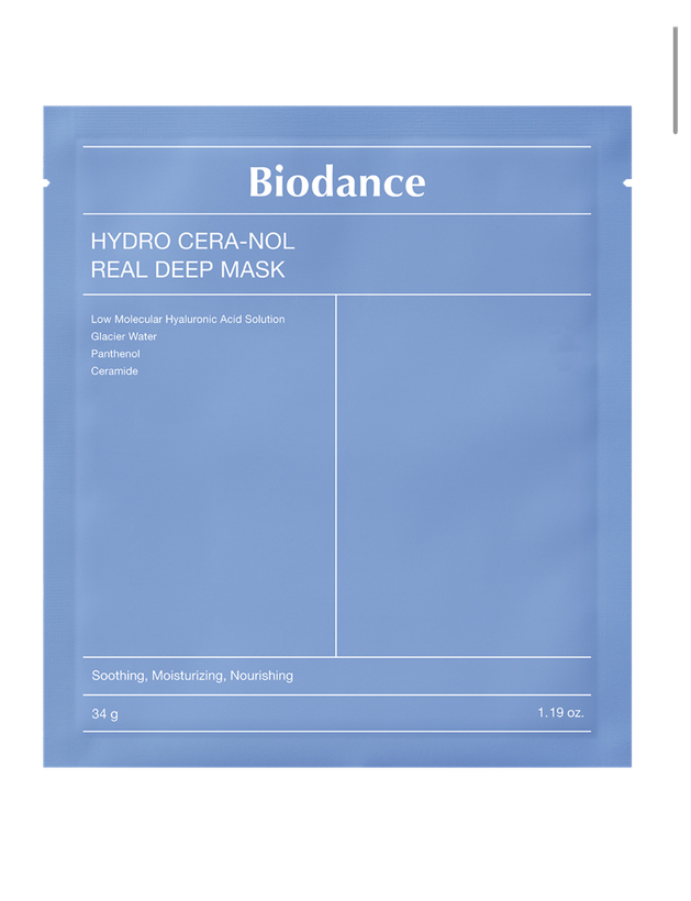 • در پایان روتین شبانه، ماسک را روی صورت قرار داده و تا صبح روی پوست بگذارید. صبح روز بعد، ماسک را برداشته و پوست را بهآرامی ماساژ دهید.ترکیبات ماسک ورقه ای بایودنس Biodance هیدرا سرانول hydro cera nol •Hydro Cera-nol (ترکیب اختصاصی بیودنس): ترکیبی از سرامیدهای چندلایه و پانتنول برای تقویت سد دفاعی پوست و تسکین التهابات.