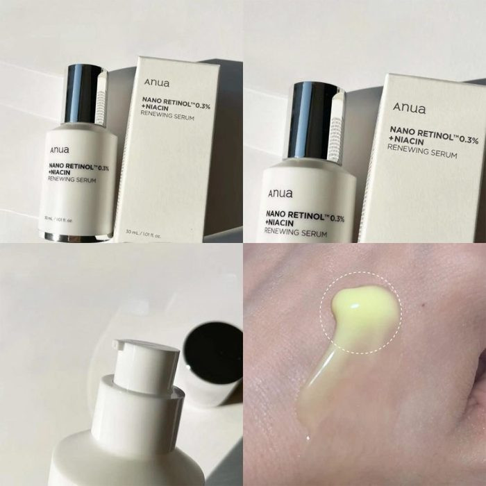 سرم نانو رتینول 0.3 درصد و نیاسین آنوا Anua – Retinol 0.3% + Niacin Renewing Serum یک سرم تجدید کننده پوست است که با ترکیب رتینول و نیاسینامید، به صاف کردن خطوط ریز و بهبودلک های صورت کمک می کند، در حالی که الاستیسیته پوست را بازیابی می نماید. این سرم با 8 نوع پپتید غنی شده است تا اثر مرطوب کنندگی را تقویت کرده و به کاهش چین و چروک ها کمک کند، در حالی که ظاهر منافذ را کمتر نمایان و پوست شل را سفت می کند.